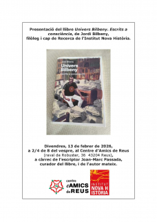 Presentació del llibre Univers Bilbeny. Escrits a consciència, de Jordi Bilbeny, filòleg i cap de Recerca de l'Institut Nova Història, a càrrec de l'escriptor Joan-Marc Passada, curador del llibre, i de l'autor mateix.