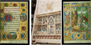 Veiem, entres les dues imatges del Llibre d’Hores dels Marçal de Montblanc, dipositat al Museu d’Art The Walters de Baltimore, als Estats Units, (l’una, la 31 de 616 segons la numeració de The Walters, que, amb caplletres i ornaments, explica la Resu