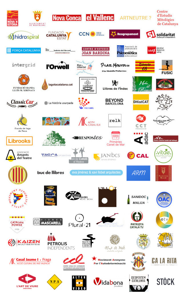 Institut Nova Història, Ajuntament de Montblanc, Nova Conca, El Vallenc, Art Neutre, Hidrospiral, Fundació Catalunya Estat, Cercle Català de Negocis, Reagrupament, Solidaritat per la Independència, Força Catalunya, Indrets del Record, Centre d’Estudis Joan Bardina, Centre d'Estudis Mitològics de Catalunya, Associació de Practicants de la Psicoestètica, Iddix Grup, Intergrid, l’Orwell, Rius de Llibertat, Pilar Montoliu Produccions, Directe 68, Fusic, Fundació Randa-Lluís M. Xirinacs, Organització per l’Alliberament de Catalunya, La Gota Catalana, Associació de Veïns Cappont de Lleida, Llibres de l'Índex, Remeieres de Vilajuïga, Fafnirius Team, Classic Car, La Història Usurpada, Poble que Canta, Beyond Barcelona, DHisCat, Enraonem, Escola de Ioga de Reus, Ecofruits Saude, Casal Jaume I d'Elx, Relk, CCT Producció, Aula de Música Tradicional de Salt, Librooks, Santuari Ecològic de Gallifa, Respostes, Primàries Canet de Mar, ADAC, Centre Cultural Català del Vallespir, Associació Amants del Teatre, Cercle Català d'Àlaba, Tasca Projectes, JAN BCS, Stöck, Centre d'Estudis Falsetans, Ineditours, Moviment Arenyenc per l'Autodeterminació, Ca la Rita, L'Art De Viure Andorra, Angelets de la Terra, Nous Projectes Audiovisuals, Altervideo, Centre Català de Luxemburg, ETV-Terramar, CAL, Patriota Català TV, Vitae Kombucha, Despertem Catalunya, Suport Civil Català, Catalan Power Corporation, Fet a mà, Kaizen Multiserveis, Associació Republicana del Maresme, Nausica Masó Orfebre, Front Patriòtic, Moviment Republicà Català, Joan&Cori Perruquers, Petrolis Independents, Plural21, L’Illot, Despatx d’Arquitectura Llobet-Jiménez, Buc de Llibres,Associació Francesc de Castellví, Vidres Mascarell, Fundació Vidabona, Restaurant Sant Francesc